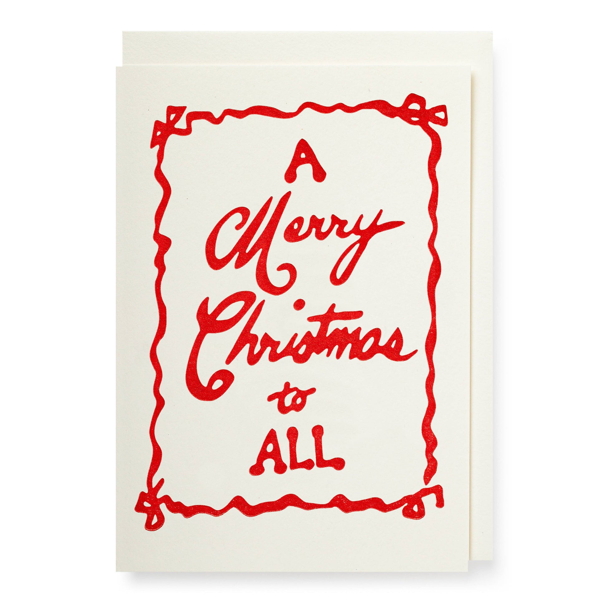 Our small letterpress card featuring the words 'A Merry Christmas to All' in red handwritten font with a red bow boarder.