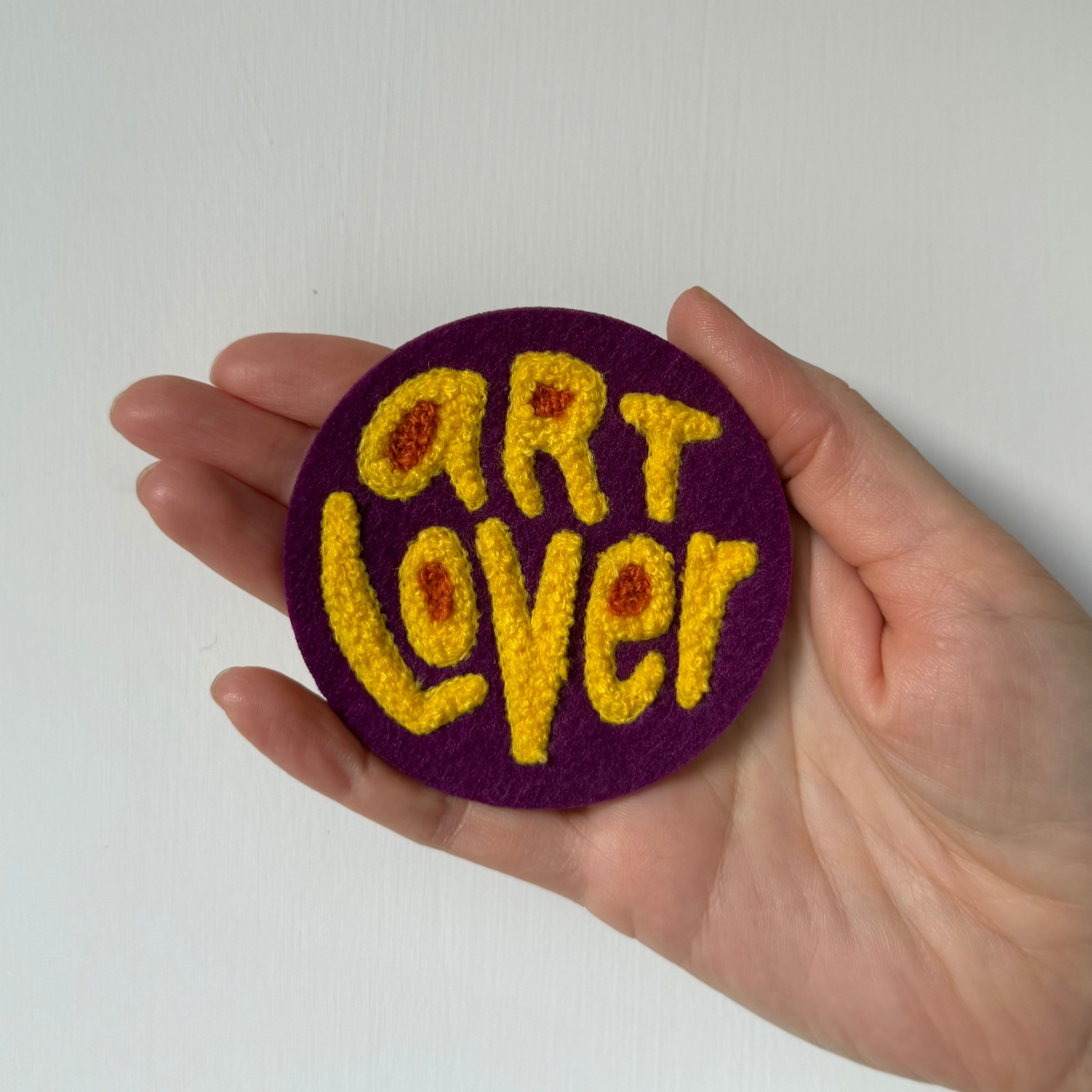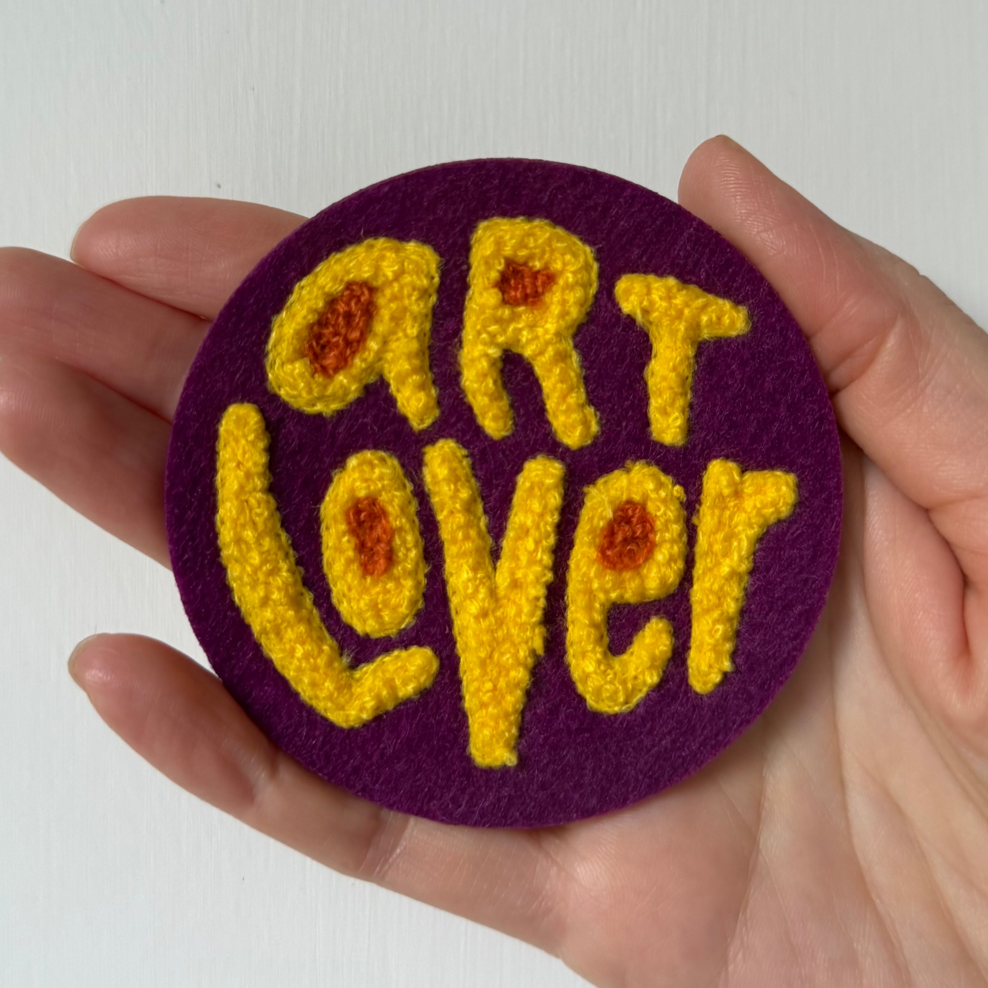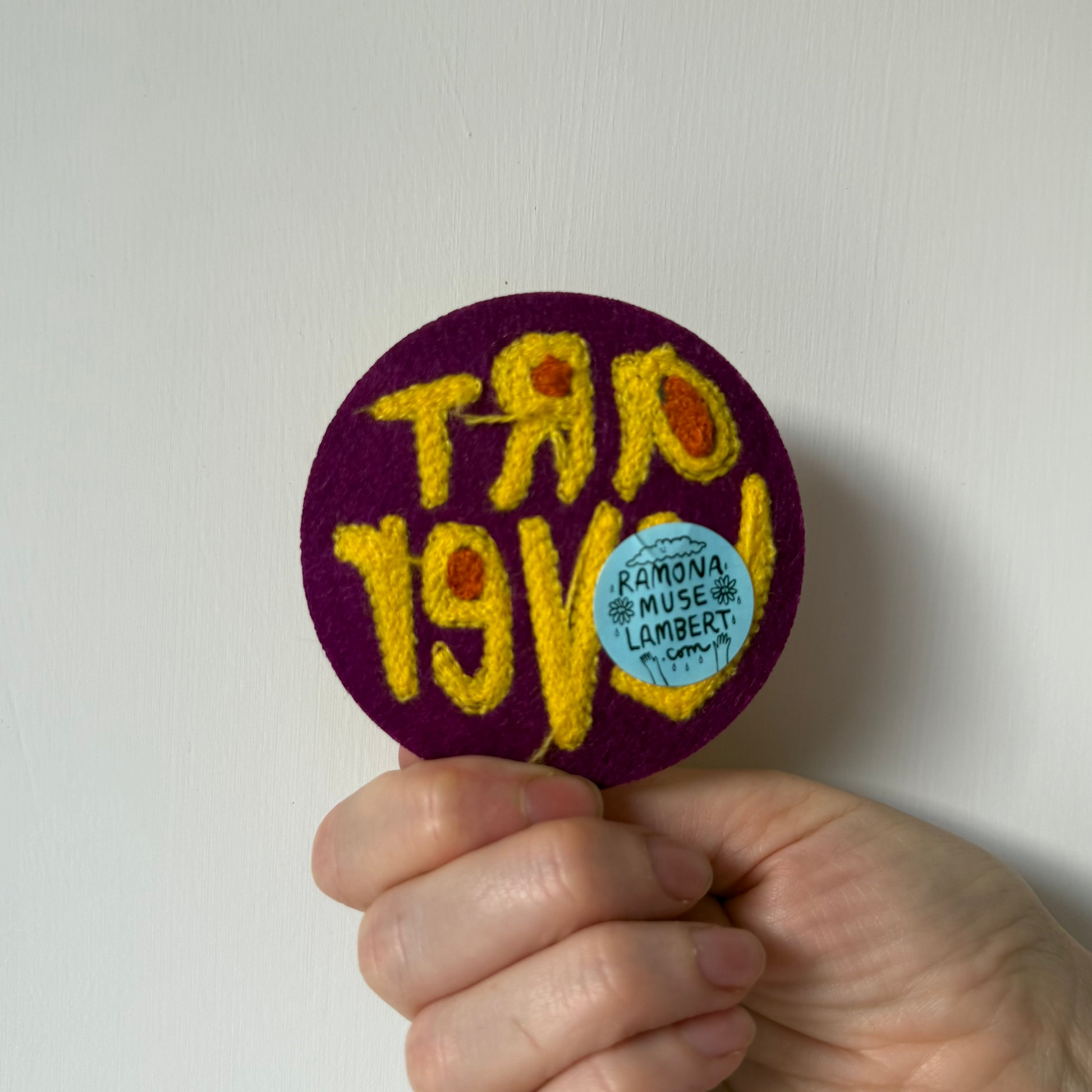 Embroidered patch, text is fuzzy chenille, background is felt.