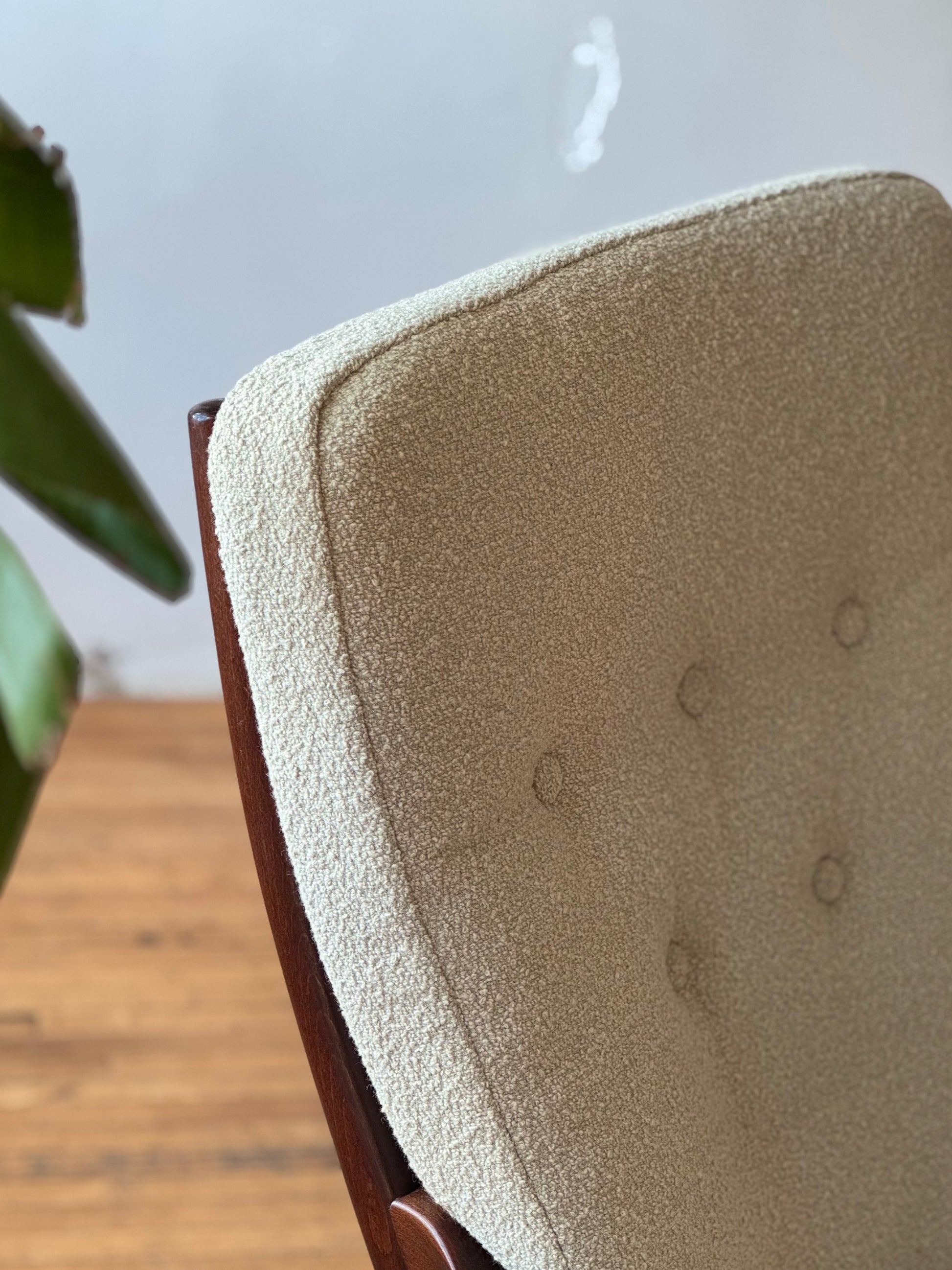 Elegant Danish Modern high-back lounge chair featuring a gently sculpted frame in rich wood tones and fresh bouclé upholstery. The tall, tufted backrest offers both comfort and support, while the open arm design adds lightness to its silhouette. A perfect blend of coziness and sophistication for any living space.