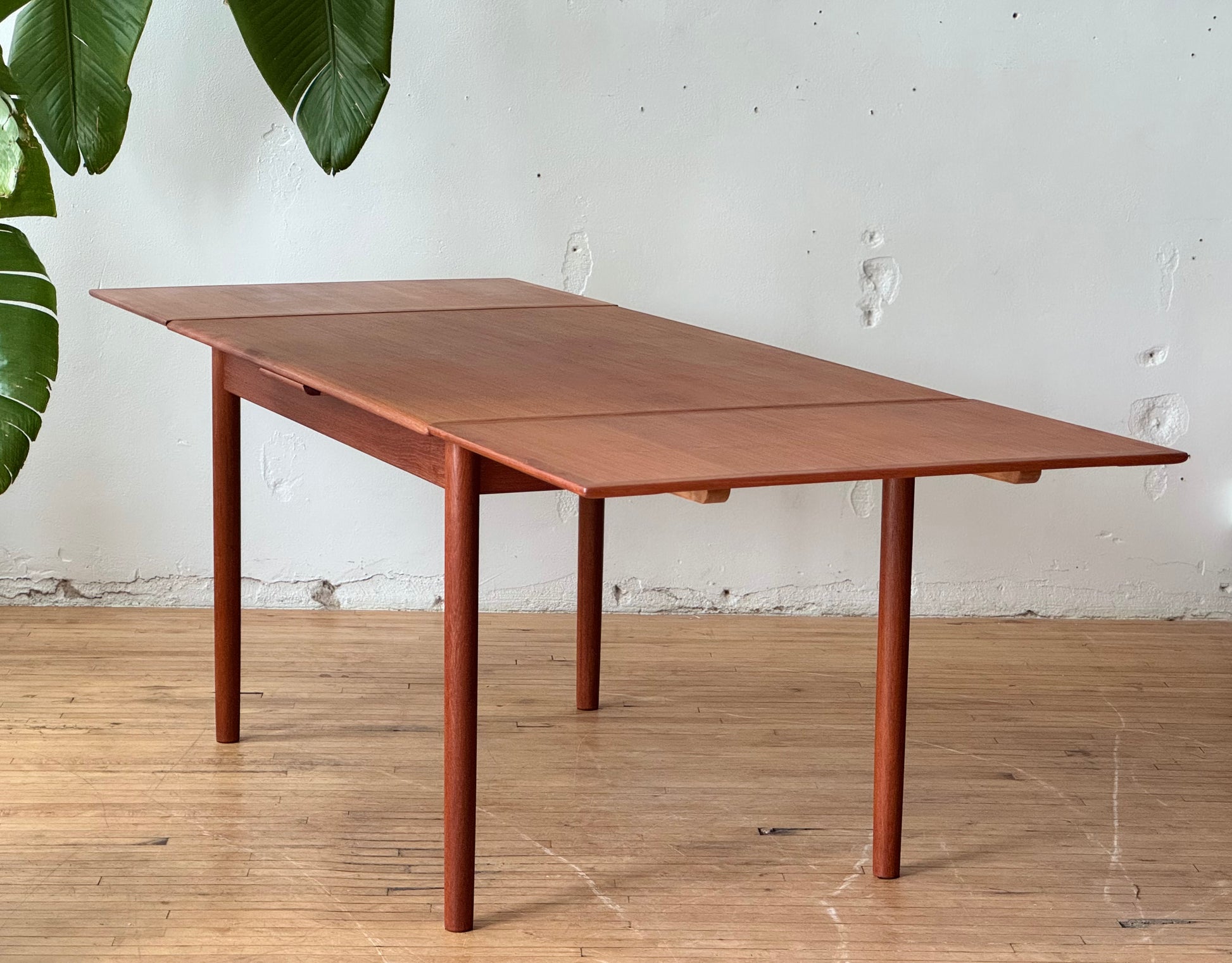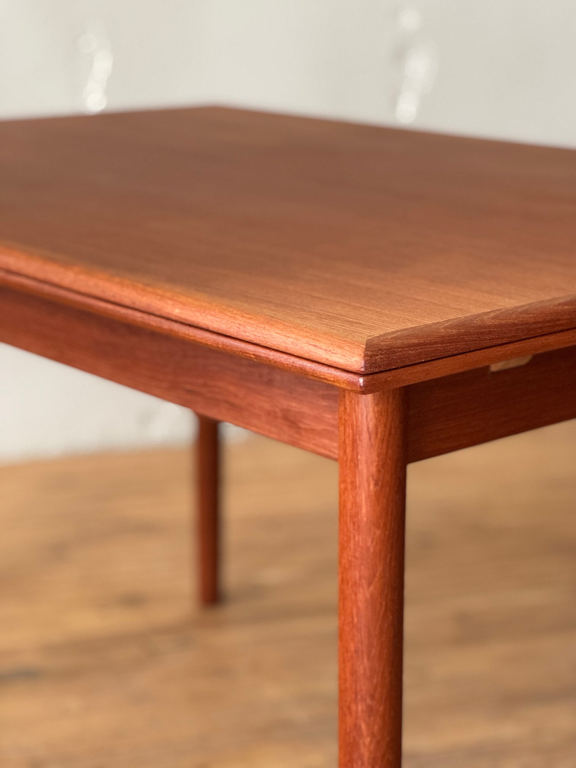 This fully restored Danish teak draw-leaf dining table beautifully balances modern function with vintage charm. Crafted in warm, richly grained teak, the table features smooth pull-out leaves on each end, allowing you to expand the surface effortlessly for gatherings or extra workspace. The restoration highlights the natural luster of the wood while preserving the character and craftsmanship of the original piece. A timeless example of Danish design—both elegant and practical—perfect for everyday dining or stylish entertaining.