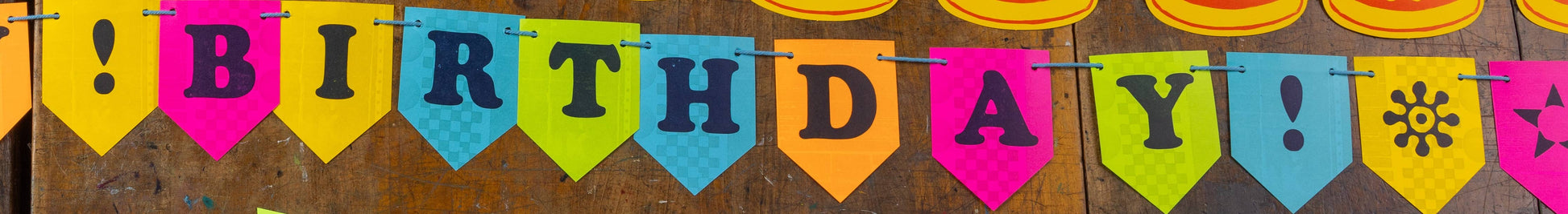 Paper garland can provide the perfect pop of color to punctuate any celebration’s décor. Our garland, designed and letterpress printed in our print shop in downtown Nashville, can adorn the porch, the backyard fence, the mantel or any wall or doorway that’s feeling a little bare. Is there any happier typeface than Cooper Black? It is the happiest type, and while we have it as small as your fingernail in metal type, we used one of our fonts of wood type to make this bold and bright birthday banner. Fun graphic elements we officially call dingbats were also printed on additional pieces to make up twelve feet of garland, and there’s a subtle background of checkerboard, circles, rectangles and more atop the day-glow paper.