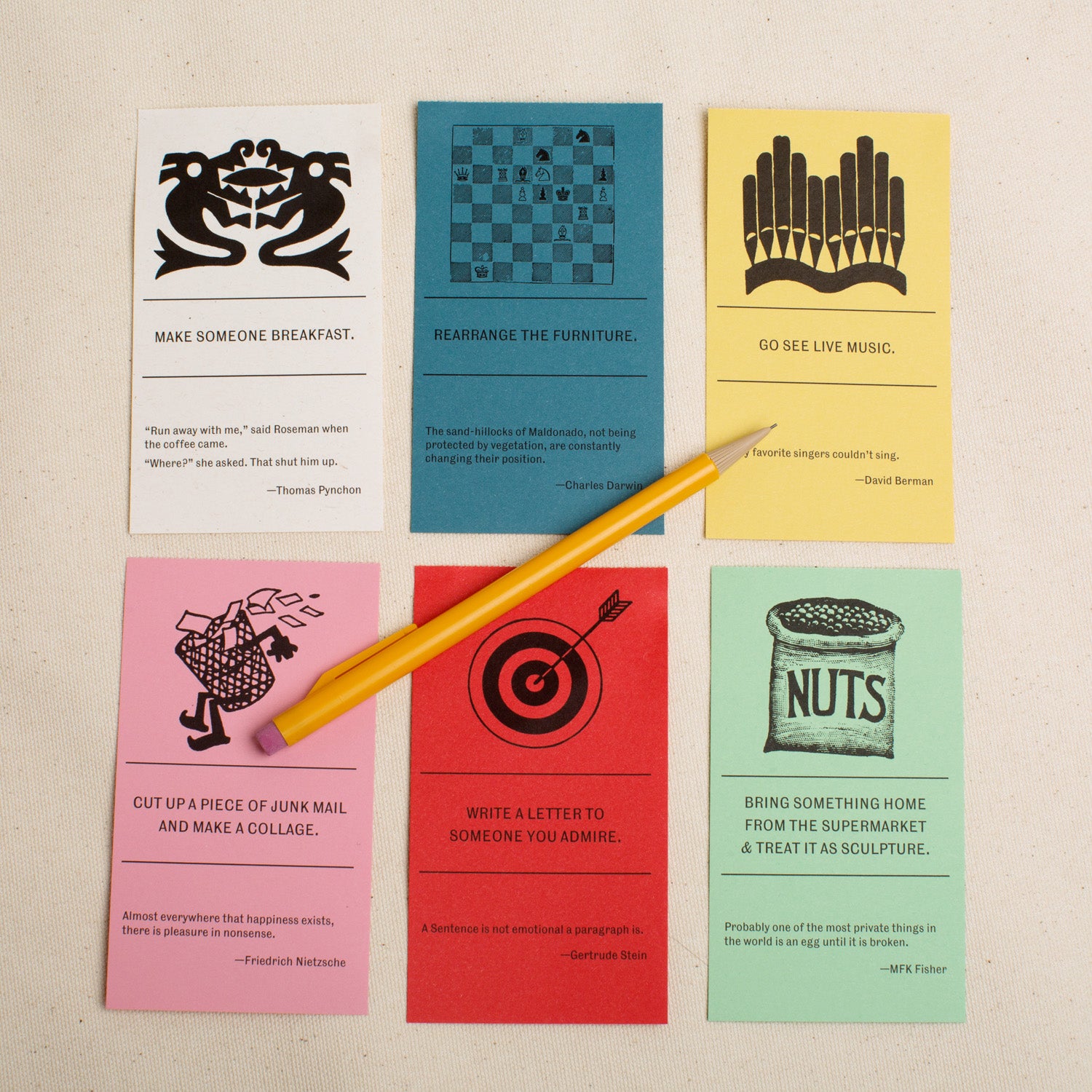 Designed as a pocket-sized coupon-style booklet with perforated pages — edited, illustrated and designed by Tamara Shopsin and Jason Fulford — OFFLINE ACTIVITIES contains 52 suggestions for engaging with the world beyond your electronic devices. “Write down a list of things you don’t like, and bury it.” “Cut up a piece of junk mail and make a collage.” “Go to the library to solve a problem.” “Listen to an album all the way through without doing anything else.” “Look into someone else’s eyes for five minutes without talking.” Part novelty, part self-help guide, each page pairs the instruction with a related graphic and a literary quote selected from a book in Tamara and Jason’s personal library. Tear out one page a week for one year, and DESTROY THIS BOOK