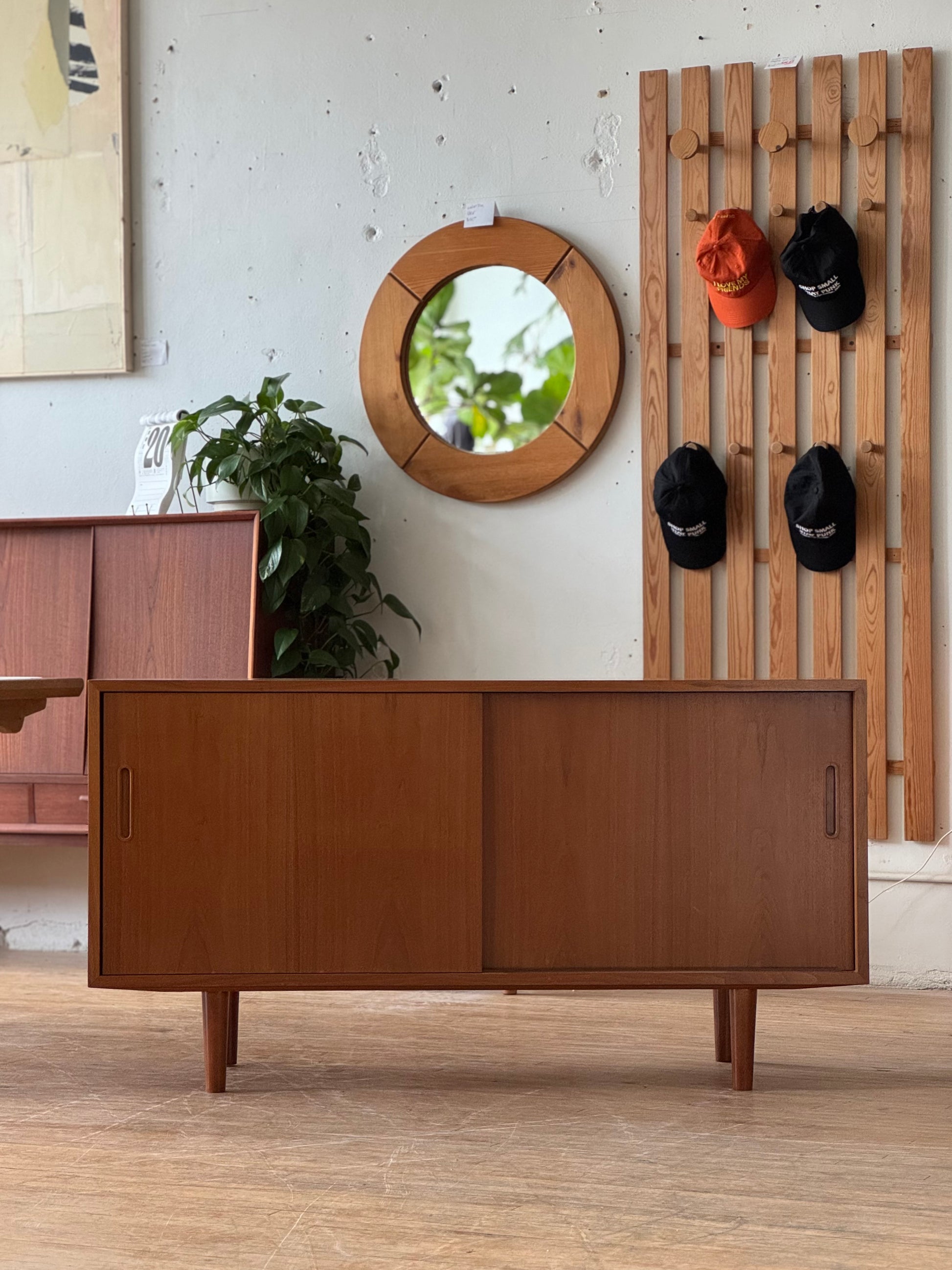 Danish modern Mid-Century walnut sideboard by Carlo Jensen. Clean, simple design with two smooth sliding doors. Beautiful warm walnut grain throughout. Ideal as a media console or vinyl storage, offering timeless style and practical storage in one piece.