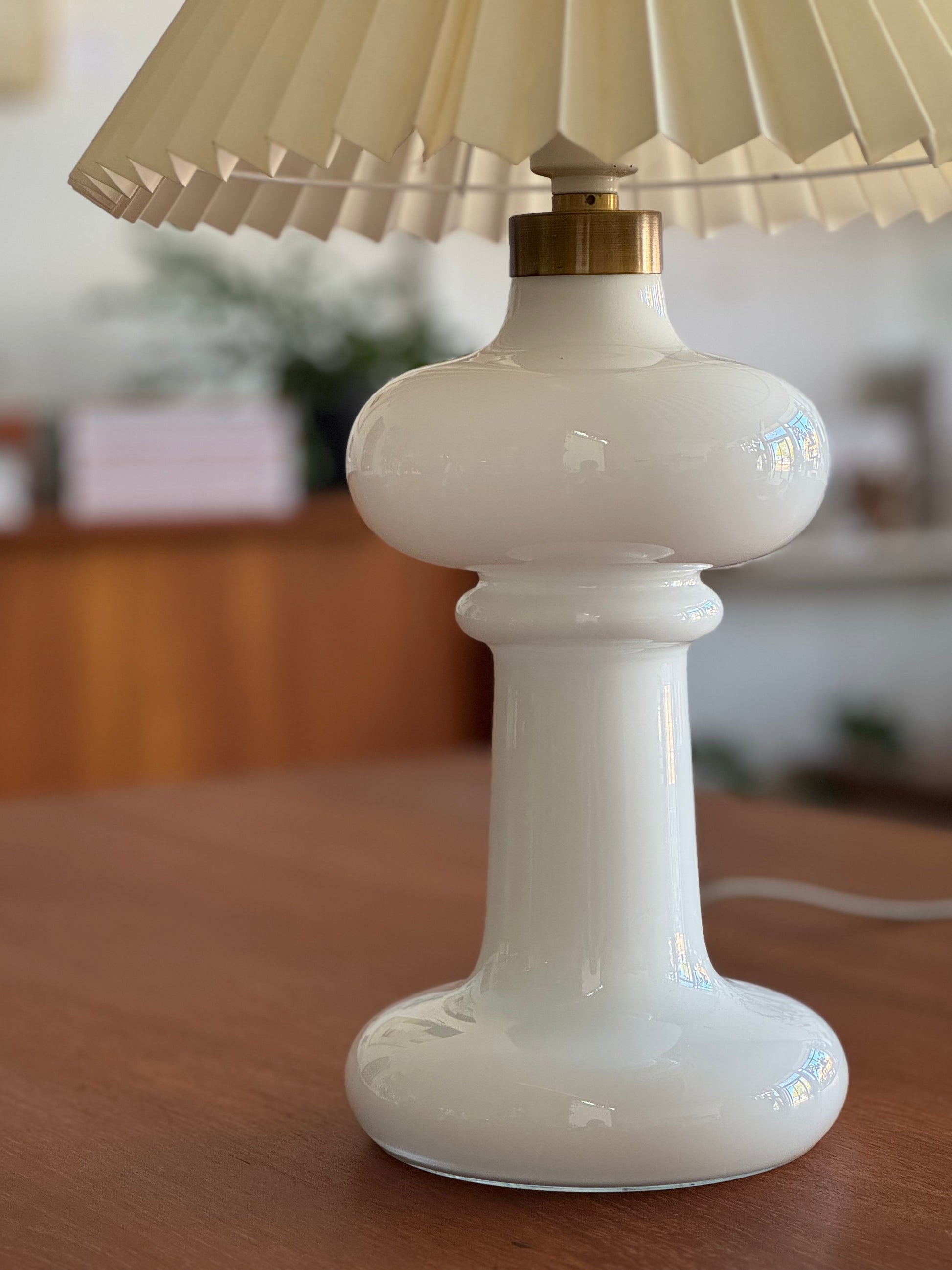 This elegant lamp from Holmegaard features a smooth white glass base, paired with a classic pleated shade for a timeless Scandinavian look. The design balances clean lines with soft textures, creating a subtle yet sophisticated accent for any room. Perfect for bedside tables, desks, or living spaces, it brings understated Danish modern style and gentle ambient lighting.
