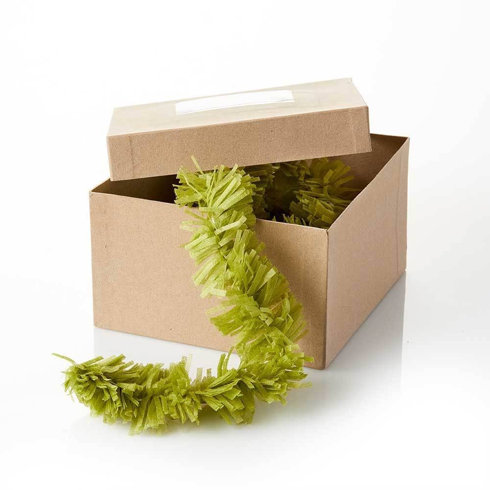 This sustainable green garland in a bright and crafted from eco-friendly silk paper fringe on a string for easy cleanup and reuse, and packaged in a reusable jute paper box. Beautiful displayed on a shelf, mantel, or tree.
