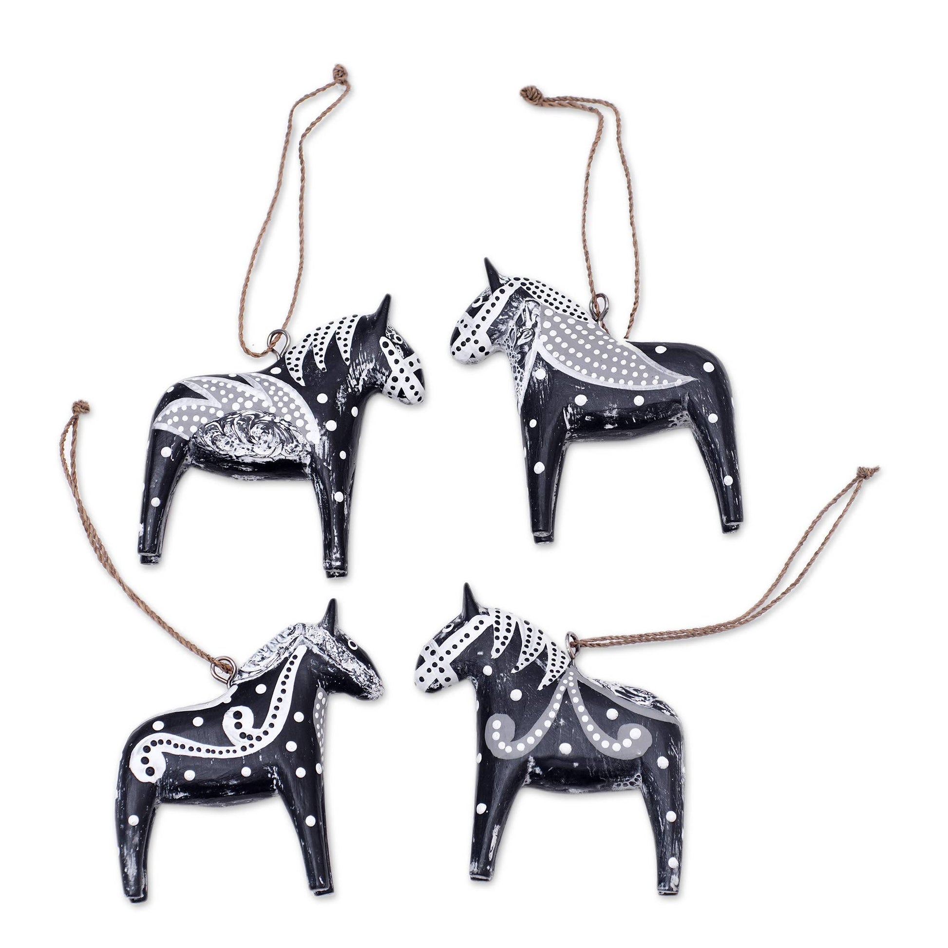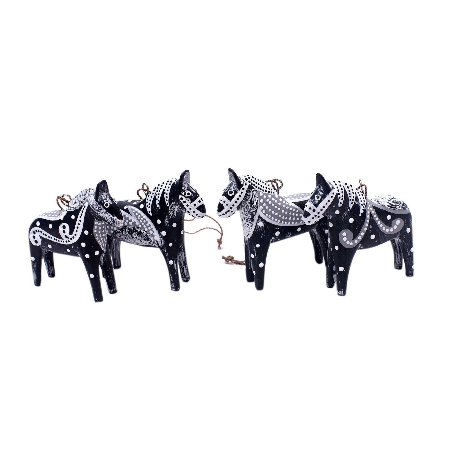 Dala or Dalecarlian horses are typical Swedish handicrafts consisting of wooden horse figurines painted by hand with charming colors and motifs. Bali's Komang Sulaksana transforms these horses into adorable ornaments, hand-carved from albesia wood and hand-painted in black, white and grey with agel grass cords to display them on the Christmas tree or your favorite spot.
