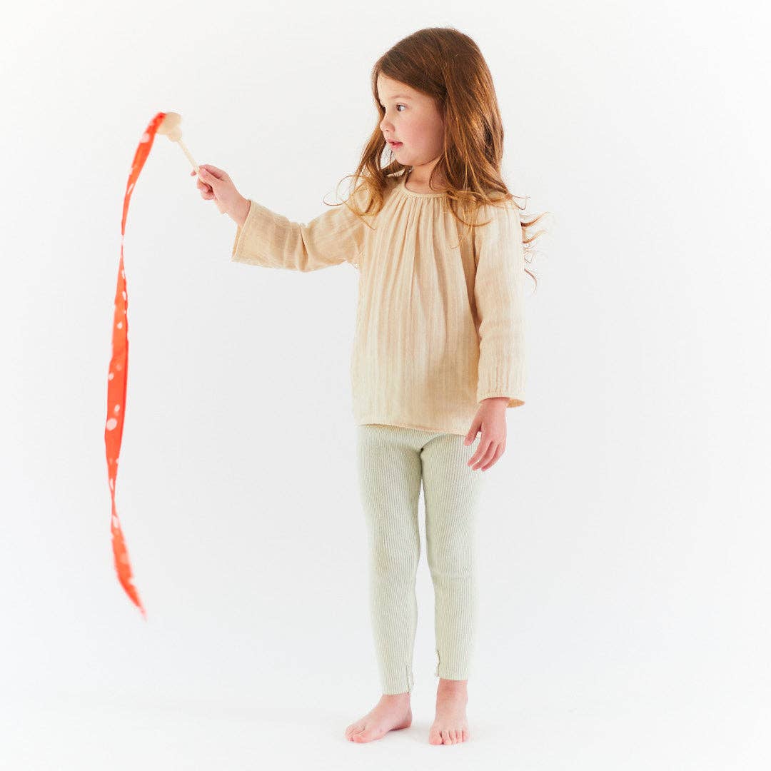 This Sarah's Silks Mini Mushroom Streamer is an 8-inch, birch wood wand with a colorful, 3-foot long, 1-inch wide Rainbow Silk Streamer. Endless fun!