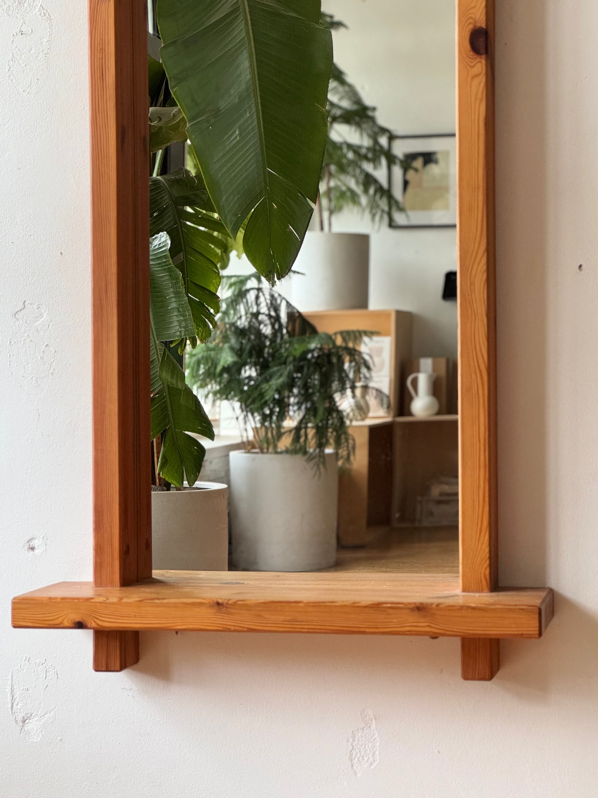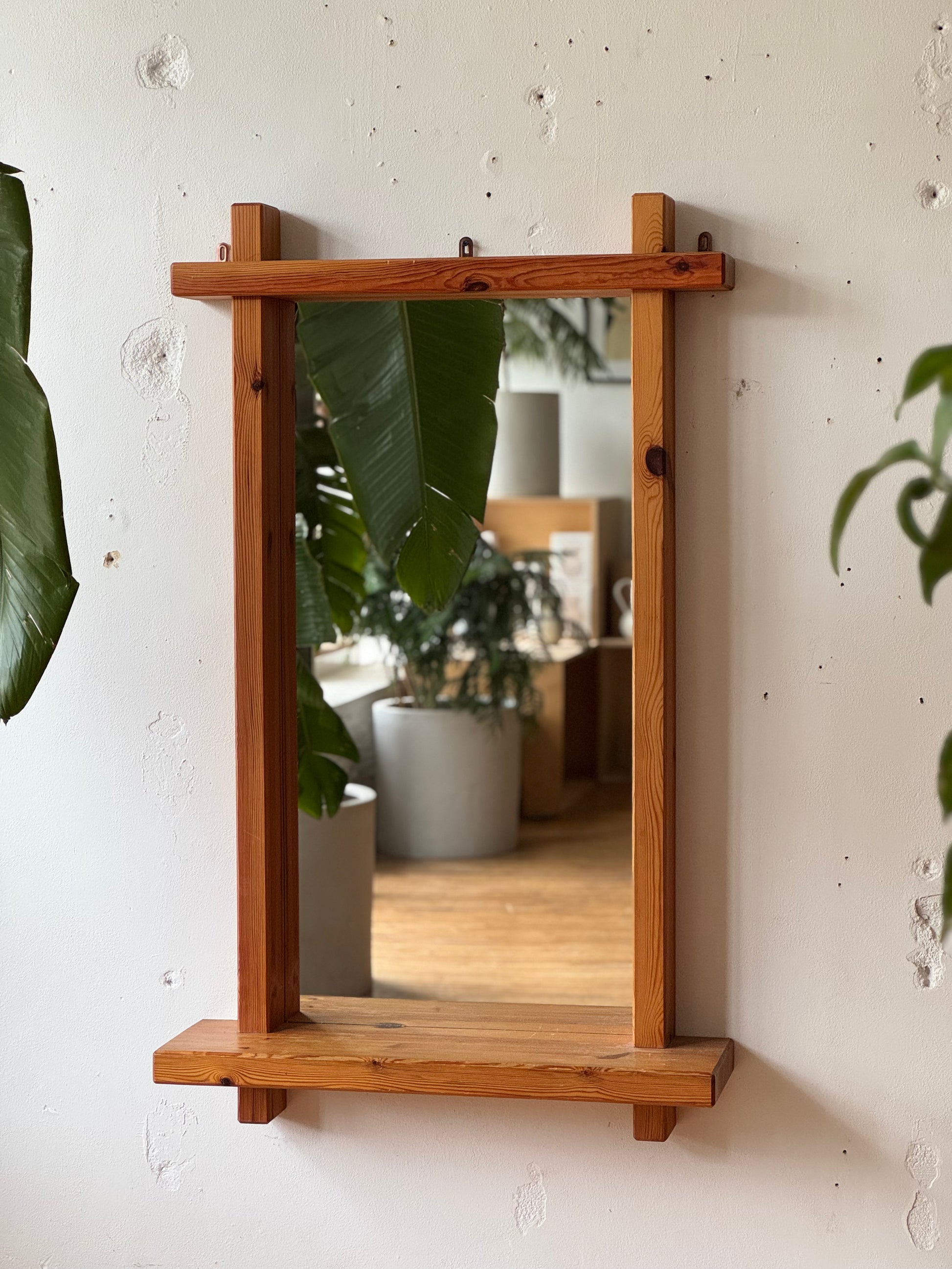 A striking rectangular mirror with a bold pine frame that shows off rich grain and warm tone. Its generous size makes it a statement piece, while the natural wear in the wood adds amazing vintage character. A versatile design that works equally well leaning against a wall or mounted to reflect light and space.